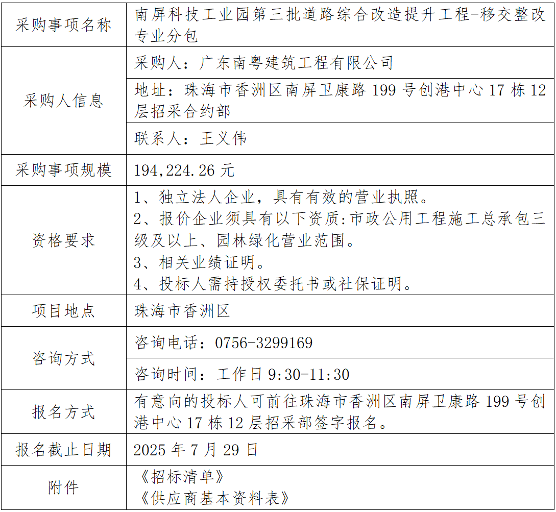南屏科技工業(yè)園第三批道路綜合改造提升工程-移交整改專業(yè)分包 專欄:工程招標 發(fā)布日期: 2025-07-23 作者:招采管理中心 附件:南屏科技工業(yè)園第三批道路綜合改造提升工程-移交整改專業(yè)分包招標清單 附件:供應商基本資料表 返回列表 上一篇:南屏科技工業(yè)園第三批道路綜合改造提升工程-移交整改專業(yè)分包(延期掛網(wǎng)) 下一篇:南屏科技工業(yè)園第二批道路綜合改造提升工程項目-市政排水管網(wǎng)移交整改(屏北二路飛天利商混路段)專業(yè)分包招標