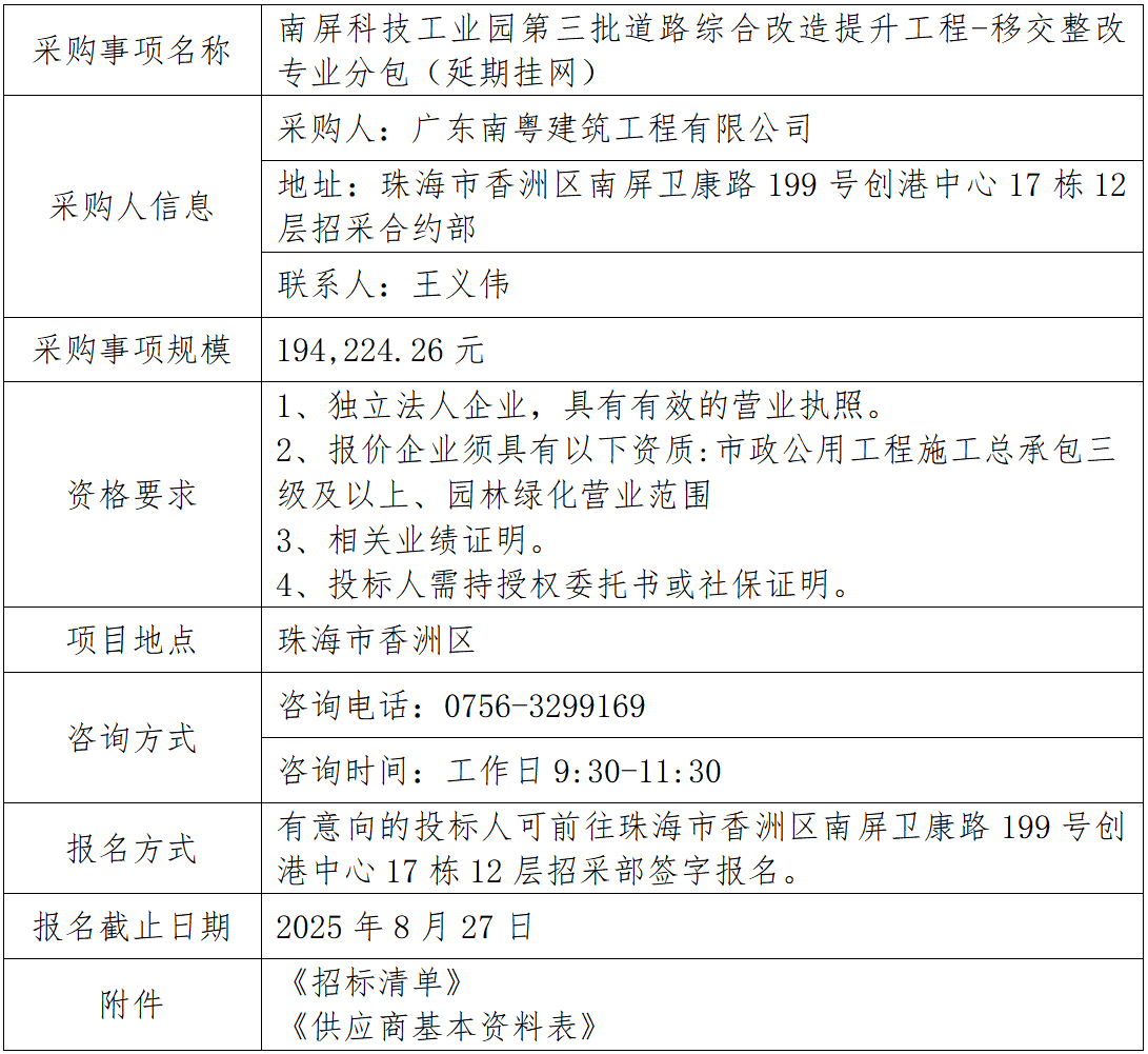 南屏科技工業(yè)園第三批道路綜合改造提升工程-移交整改專業(yè)分包(延期掛網(wǎng)) 專欄:工程招標 發(fā)布日期: 2025-08-21 作者:招采管理中心 附件:南屏科技工業(yè)園第三批道路綜合改造提升工程-移交整改專業(yè)分包招標清單 附件:供應(yīng)商基本資料表 返回列表 上一篇:三溪科創(chuàng)小鎮(zhèn)二期道路-智慧路燈照明工程整改移交專業(yè)分包 下一篇:南屏科技工業(yè)園第三批道路綜合改造提升工程-移交整改專業(yè)分包