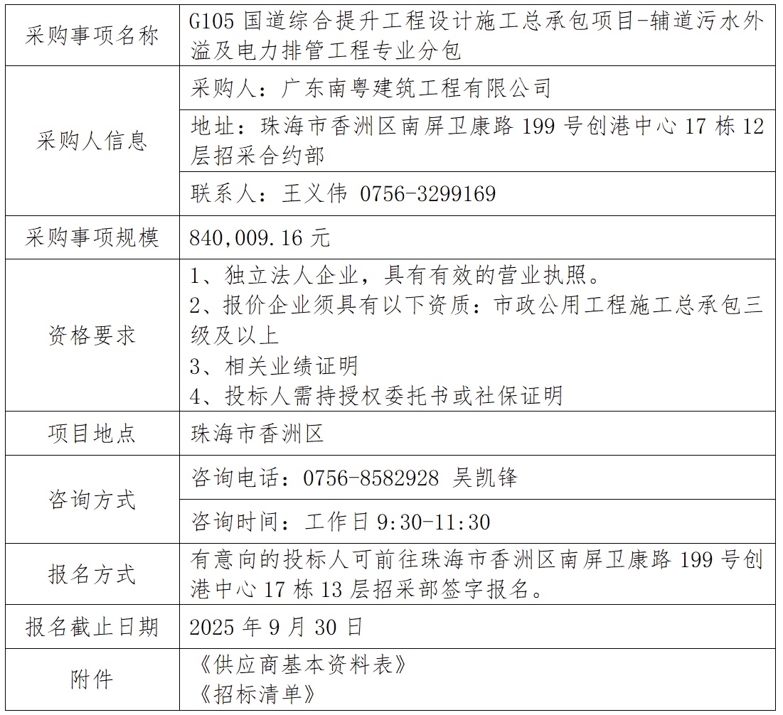 G105國道綜合提升工程設(shè)計(jì)施工總承包項(xiàng)目-輔道污水外溢及電力排管工程專業(yè)分包 專欄:工程招標(biāo) 發(fā)布日期: 2025-09-25 作者:招采管理中心 附件:供應(yīng)商基本資料表 附件:G105國道綜合提升工程設(shè)計(jì)施工總承包項(xiàng)目-輔道污水外溢及電力排管工程專業(yè)分包-招標(biāo)清單 返回列表 上一篇:鳳凰山山地步道項(xiàng)目(香山湖公園至海天公園段)-全線整改、維修工程專業(yè)分包 下一篇:三溪科創(chuàng)小鎮(zhèn)二期道路-智慧路燈照明工程整改移交專業(yè)分包(延期公示)