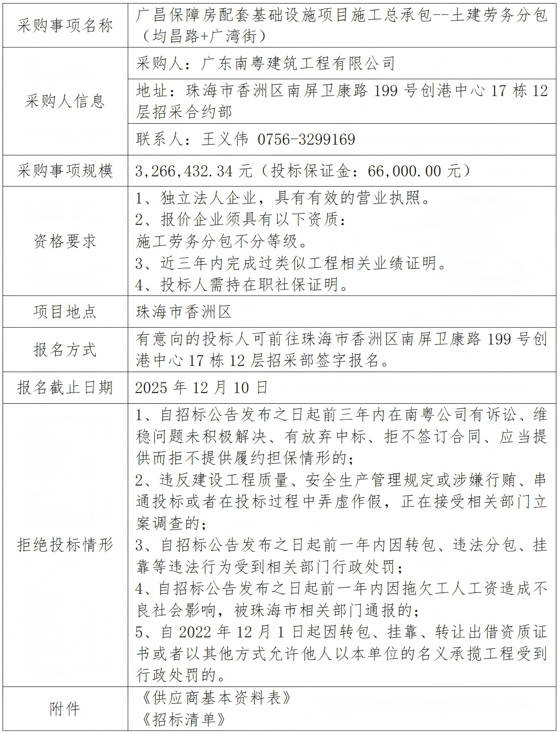廣昌保障房配套基礎(chǔ)設(shè)施項目施工總承包--土建勞務(wù)分包(均昌路+廣灣街) 專欄:工程招標(biāo) 發(fā)布日期: 2025-12-04 作者:招采管理中心 附件:供應(yīng)商基本資料表 附件:廣昌保障房配套基礎(chǔ)設(shè)施項目施工總承包--土建勞務(wù)分包(均昌路+廣灣街)招標(biāo)清單 返回列表 上一篇:廣昌保障房配套基礎(chǔ)設(shè)施項目施工總承包-鋼管租賃服務(wù) 下一篇:廣昌保障房配套基礎(chǔ)設(shè)施項目施工總承包-安保、保潔服務(wù)
