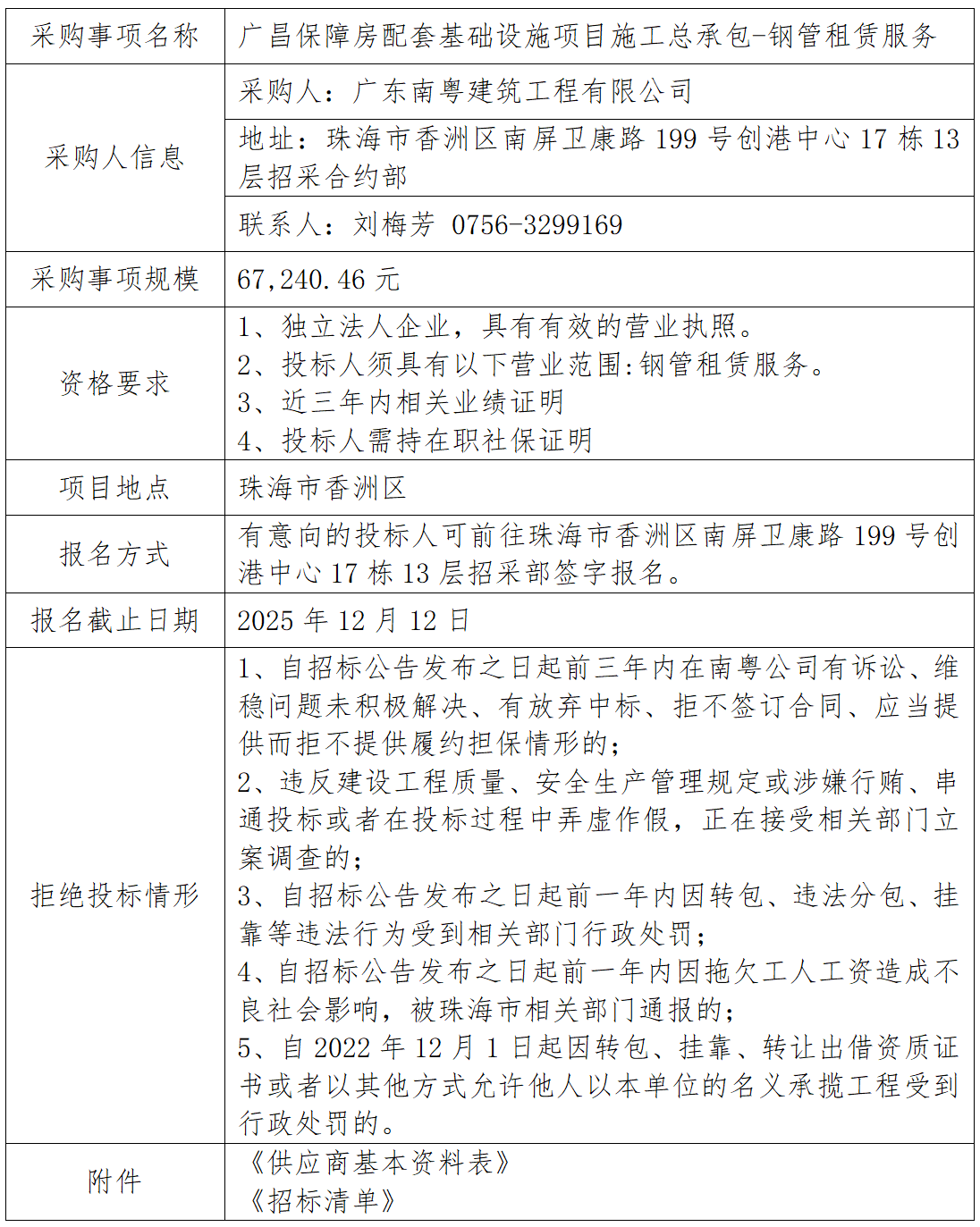 廣昌保障房配套基礎設施項目施工總承包-鋼管租賃服務 專欄:工程招標 發(fā)布日期: 2025-12-09 作者:招采管理中心 附件:供應商基本資料表 附件:廣昌保障房配套基礎設施項目施工總承包-鋼管租賃服務招標預算清單 -空白清單 返回列表 上一篇:廣昌保障房配套基礎設施項目施工總承包-地材材料采購招標(延期掛網(wǎng)) 下一篇:廣昌保障房配套基礎設施項目施工總承包--土建勞務分包(均昌路+廣灣街)