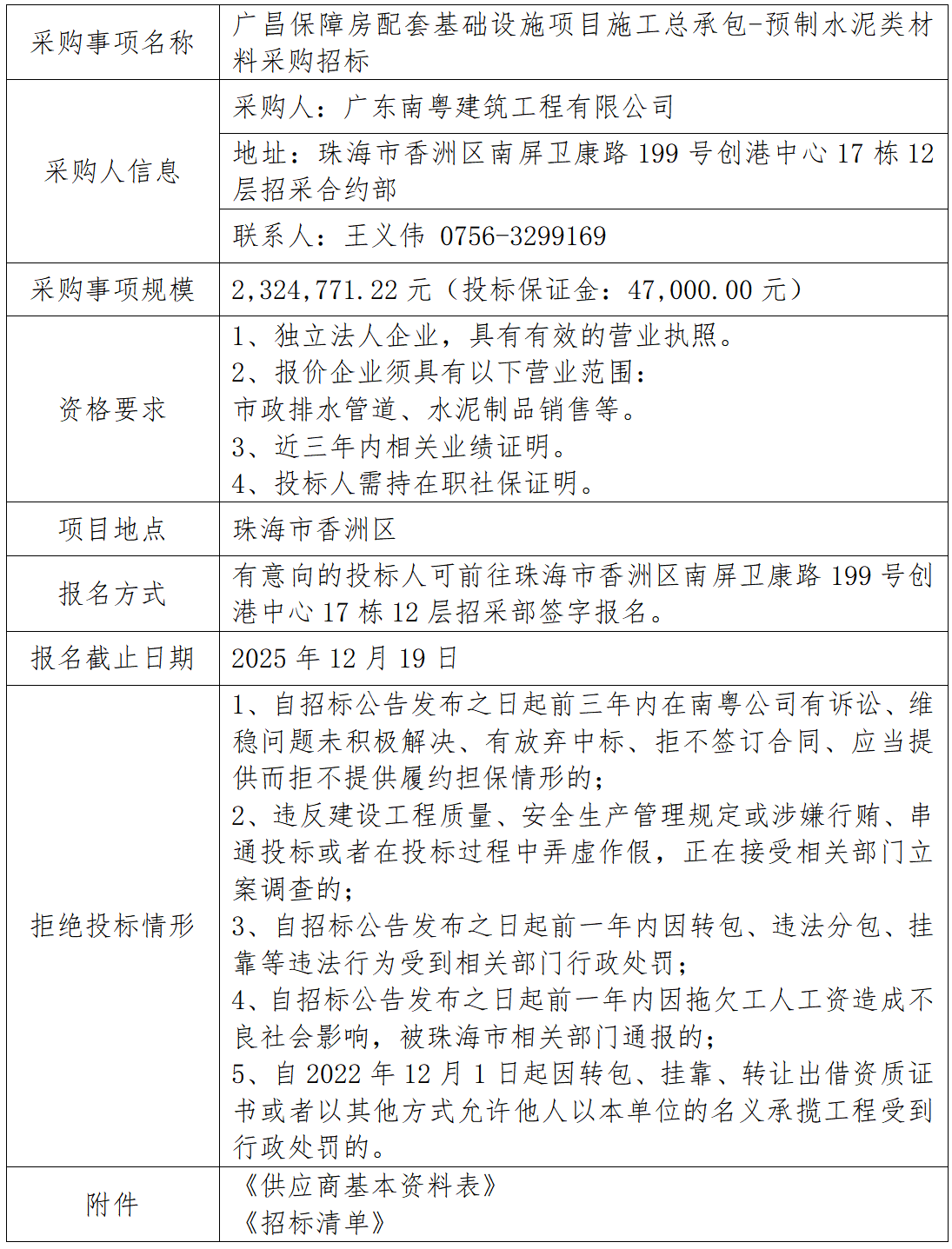 廣昌保障房配套基礎(chǔ)設(shè)施項(xiàng)目施工總承包-預(yù)制水泥類材料采購招標(biāo) 專欄:工程招標(biāo) 發(fā)布日期: 2025-12-16 作者:招采管理中心 附件:供應(yīng)商基本資料表 附件:廣昌保障房配套基礎(chǔ)設(shè)施項(xiàng)目施工總承包-預(yù)制水泥類材料采購招標(biāo)清單 返回列表 上一篇:洪灣舊村更新項(xiàng)目周邊環(huán)山路等市政道路工程-箱變工程專業(yè)分包 下一篇:仁恒星園-翠前路交翠峰路遷移交通信號(hào)燈項(xiàng)目