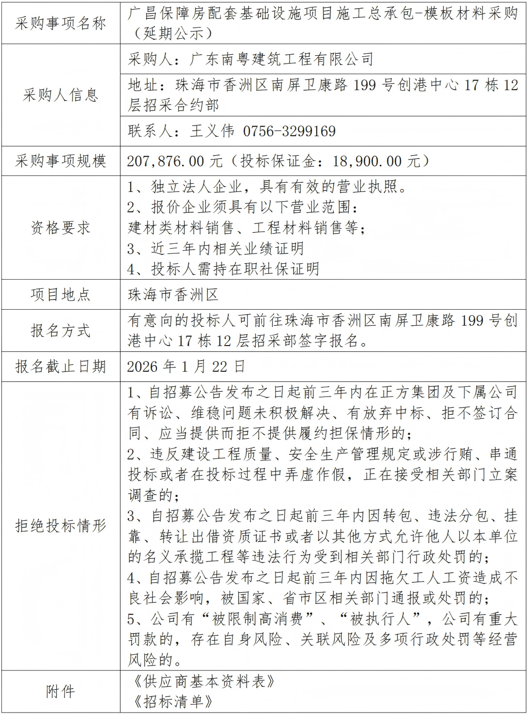 廣昌保障房配套基礎(chǔ)設(shè)施項(xiàng)目施工總承包-模板材料采購(延期公示) 專欄:工程招標(biāo) 發(fā)布日期: 2026-01-19 作者:招采管理中心 附件:供應(yīng)商基本資料表 附件:廣昌保障房配套基礎(chǔ)設(shè)施項(xiàng)目施工總承包-模板材料采購招標(biāo)清單 返回列表 上一篇:廣昌保障房配套基礎(chǔ)設(shè)施項(xiàng)目施工總承包-預(yù)制水泥類材料采購招標(biāo)(預(yù)算變更) 下一篇:廣昌保障房配套基礎(chǔ)設(shè)施項(xiàng)目施工總承包--土石方工程專業(yè)分包(第二次)