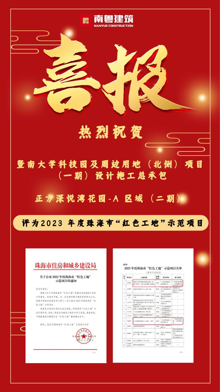 2023年,集團(tuán)黨委辦指導(dǎo)打造的暨南大學(xué)科技園及周邊用地(北側(cè))項目(一期)設(shè)計施工總承包、正方深悅灣花園-A區(qū)域(二期)積極發(fā)揮臨時黨支部戰(zhàn)斗堡壘作用和黨員先鋒模范作用,堅持黨對建筑業(yè)工作的全面領(lǐng)導(dǎo),以建筑業(yè)“紅色工地”黨的建設(shè)為載體,引領(lǐng)項目堅持質(zhì)量、安全兩手抓、兩手硬,成功入圍2023年全市12個示范項目,合力推進(jìn)工程項目高質(zhì)量建設(shè)。