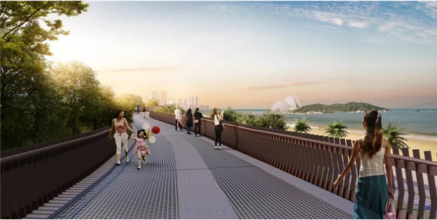項目將景山公園與情侶路沿岸連接起來,從地面到空中,串聯(lián)起山海資源與浪漫的濱海景觀。與此同時,打通車行及人行通道,形成人行立體交通,可杜絕行人橫穿馬路。