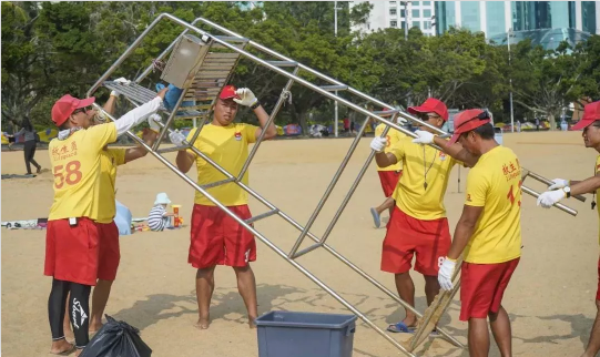 每年城市客廳閉海,香洲正方都會派出“小黃人”對沙灘進行全面清潔。21名“小黃人”在沙灘上一字排開,拾撿海灘上的煙頭、紙屑等垃圾,干勁十足,相互協作,經過一個小時的努力,將沙灘清理的干凈整潔。