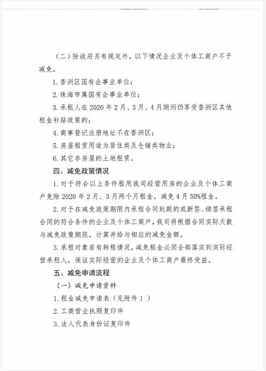 (一)針對(duì)承租我司經(jīng)營性用房從事生產(chǎn)、辦公、批發(fā)零售、餐飲、超市、藥店及其他便民服務(wù)的,且在香洲區(qū)注冊(cè),按照政府要求落實(shí)防疫規(guī)定的企業(yè)及個(gè)體工商戶