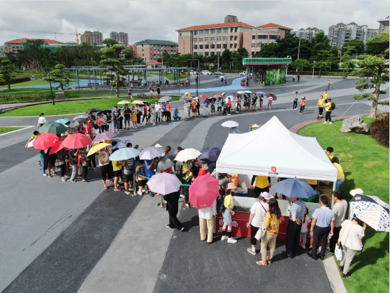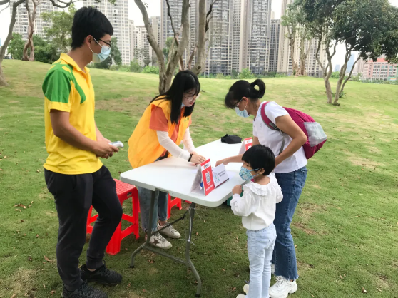在活動(dòng)開(kāi)始之前,小朋友和家長(zhǎng)們經(jīng)過(guò)工作人員測(cè)量體溫、掃描粵康碼登記等防疫檢查。