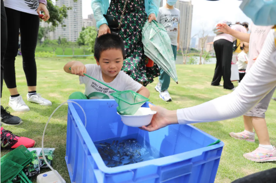 “一條、兩條、三條,成功啦!”在最后的解救“波妞“環(huán)節(jié),競(jìng)爭(zhēng)異常激烈,小朋友和家長(zhǎng)一起拿著小網(wǎng)兜,在魚(yú)池中小心翼翼地網(wǎng)起小魚(yú)。