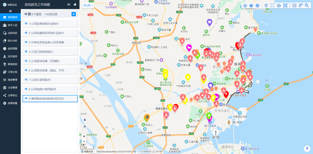 香洲正方利用信息技術(shù)和大數(shù)據(jù)優(yōu)勢(shì),結(jié)合防風(fēng)防汛工作實(shí)際情況,在地圖無憂軟件平臺(tái)繪制“防風(fēng)防汛一張地圖”,分別建立了應(yīng)急搶險(xiǎn)隊(duì)伍、勞務(wù)單位應(yīng)急隊(duì)伍、三防物資、水浸黒點(diǎn)、地質(zhì)災(zāi)害風(fēng)險(xiǎn)點(diǎn)、在建項(xiàng)目工程大型裝備等信息模塊,并將重點(diǎn)應(yīng)急搶險(xiǎn)區(qū)域作了明確劃分,進(jìn)一步提升了公司防汛應(yīng)急處置能力。