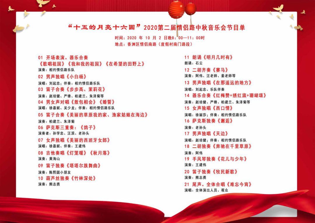 在浪漫的情侶路邊,2020第二屆情侶路中秋音樂會“十五的月亮十六圓”與你相約~21個精彩音樂會節(jié)目以創(chuàng)新的形式來表達中華文化,及對中秋的美好祝愿。