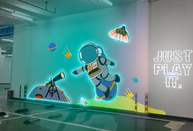 場(chǎng)內(nèi)一共繪制了7組壁畫,高度近4米。更別致的是,壁畫以外還加裝了霓虹燈帶,提升了壁畫的視覺沖擊力,搞怪有趣,十分可愛。