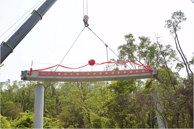 因香山云道作業(yè)處山林陡峭,整條云道共需安裝630座鋼梁。主線首跨鋼梁吊裝是按照先導(dǎo)試點(diǎn)的原則,實(shí)行首件工程制度——以首件工程樣板示范,引領(lǐng)后續(xù)各標(biāo)段同類工程的標(biāo)準(zhǔn)化施工。首跨鋼梁吊裝完成后,陸續(xù)吊裝在山林中的鋼梁將成為撐起香山云道的脊梁。