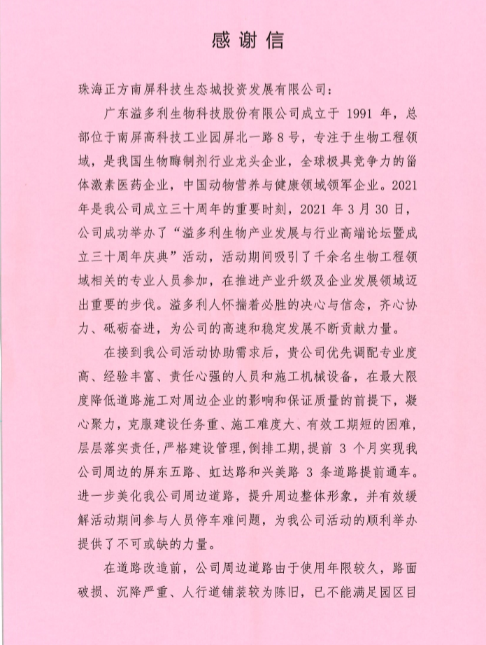 4月21日,廣東溢多利生物科技股份有限公司為珠海正方南屏科技生態(tài)城投資有限公司(以下稱(chēng)正方生態(tài)城公司)送來(lái)一面錦旗和一封感謝信,為正方生態(tài)城公司的專(zhuān)業(yè)水平和匠心精神點(diǎn)贊,并致以誠(chéng)摯的謝意,同時(shí)也見(jiàn)證了正方控股作為區(qū)屬?lài)?guó)企為助推南屏科技生態(tài)城的發(fā)展升級(jí)發(fā)揮的重要作用。