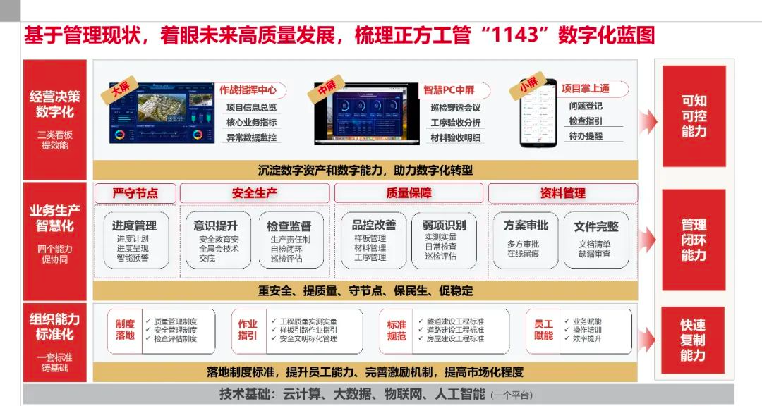 正方集團(tuán)工程管理系統(tǒng)以“一個(gè)平臺(tái)管落地、一套標(biāo)準(zhǔn)鑄基礎(chǔ)、四個(gè)能力促協(xié)同、三類看板提效能”作為該系統(tǒng)建設(shè)方向,解決了“管理效能低、協(xié)同效率差、標(biāo)準(zhǔn)落地難”等問題。