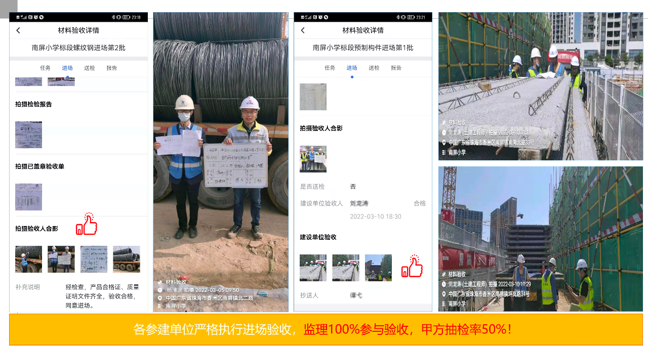亮點(diǎn)五:材料進(jìn)場(chǎng)驗(yàn)收線上化、流程化,監(jiān)理100%參與驗(yàn)收,甲方按比例抽檢,從材料源頭抓好質(zhì)量。