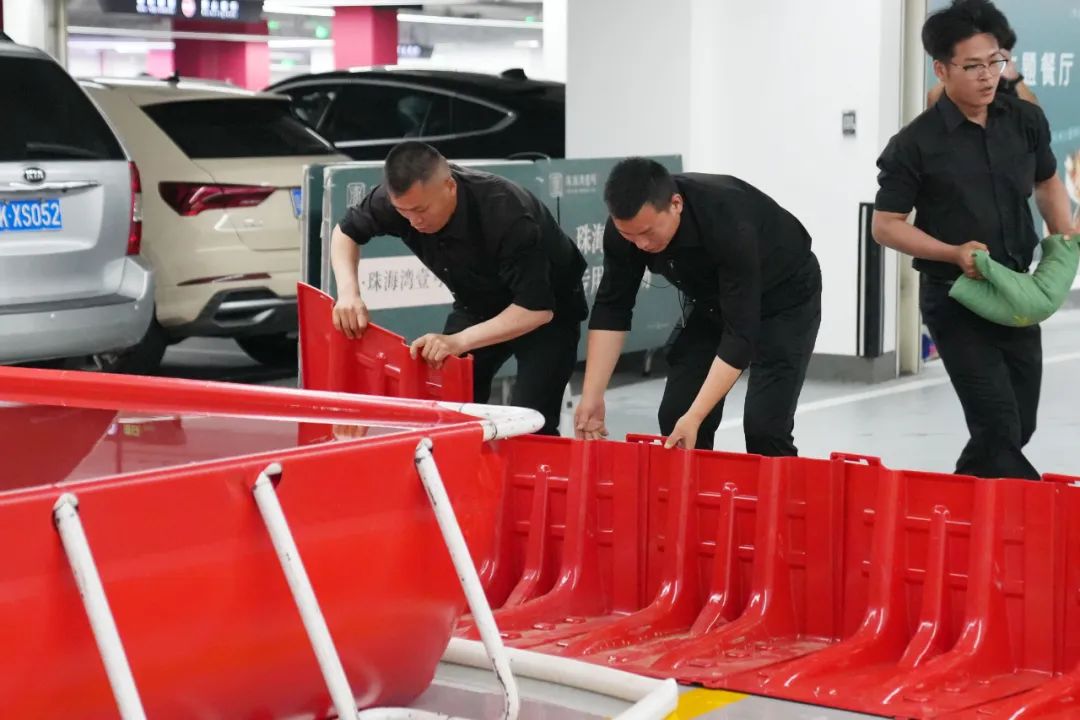 大雨傾盆,雨水不斷積聚。應急處置組調配人員,在車庫出入口處安裝防洪擋板,壓放沙袋,阻擋雨水漫入。