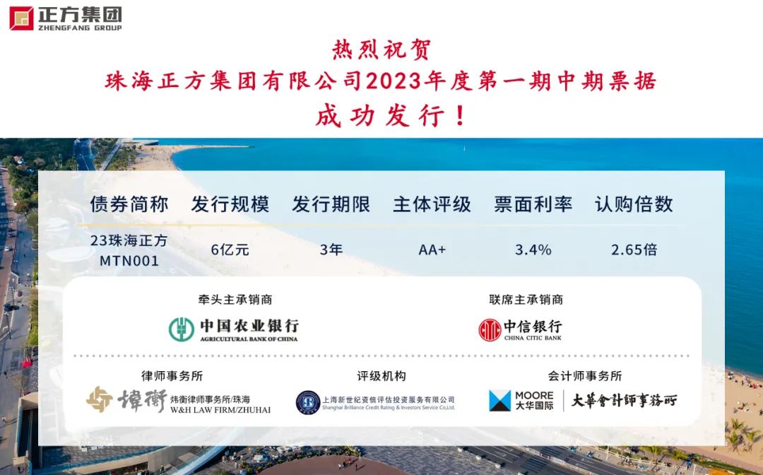 6月15日,正方集團(tuán)首期中期票據(jù)成功發(fā)行!該筆債券是正方集團(tuán)首筆公募債券,具有開(kāi)創(chuàng)性意義。本次發(fā)行規(guī)模人民幣6億元,期限3年,票面利率3.40%,創(chuàng)區(qū)域內(nèi)同類企業(yè)新低,樹(shù)立了新的市場(chǎng)標(biāo)桿。