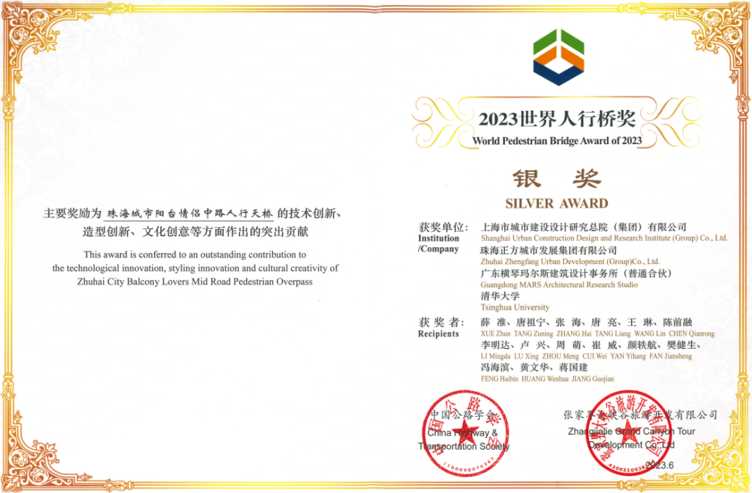 世界人行橋獎于2019年設(shè)立,每兩年評選一次,主要獎勵世界杰出人行橋的建設(shè)、設(shè)計、施工單位及主要技術(shù)人員,是世界人行橋領(lǐng)域的權(quán)威獎項。獎項一經(jīng)設(shè)立,就得到國內(nèi)外的積極響應(yīng)。除中國外,美國、德國、意大利、西班牙等國家分別申報過項目。2023年,共收到申報項目26項,經(jīng)過專家評審,評選出金獎1項、銀獎2項、銅獎3項。