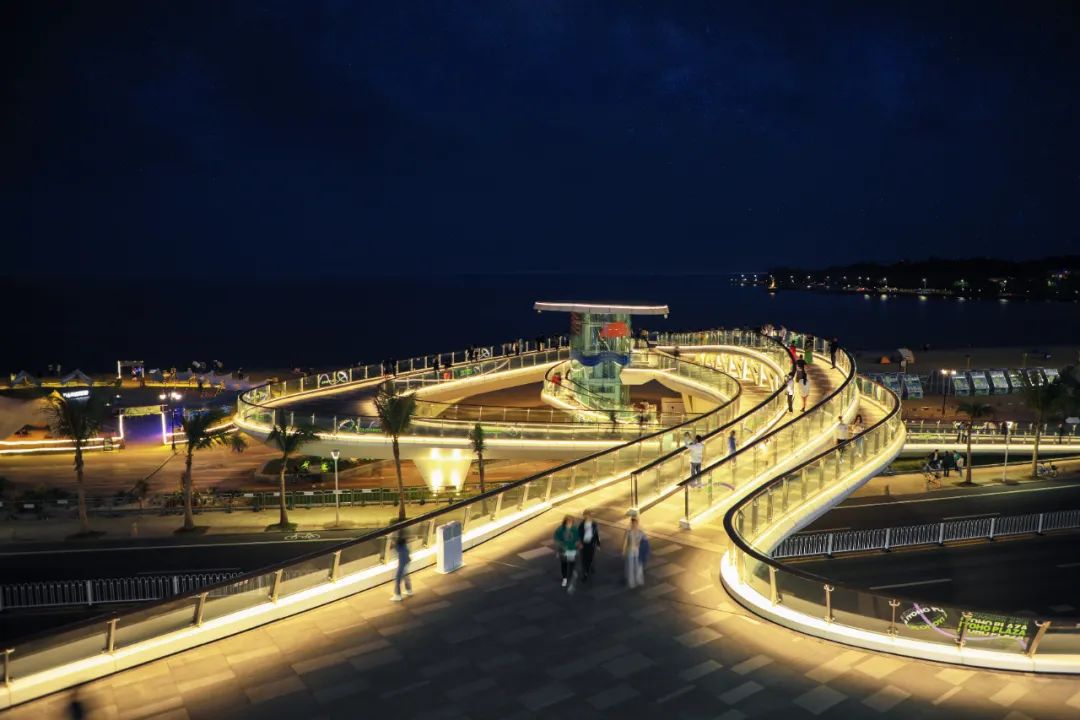 項目建設(shè)中,珠海正方城市發(fā)展集團(tuán)有限公司銳意創(chuàng)新,組織多方設(shè)計資源,堅持“通達(dá)山海,構(gòu)建情侶路浪漫風(fēng)情景觀帶慢行系統(tǒng)重要活動節(jié)點(diǎn)”和“創(chuàng)新形象,打造城市全新名片”的理念,采用同心結(jié)回旋式無障礙坡道設(shè)計,在滿足行人游客上下橋需求的同時,巧妙呼應(yīng)了情侶路浪漫的愛情主題;創(chuàng)造性地采用雙層鋼箱橋面——桁架組合結(jié)構(gòu),大幅降低鋼箱高跨比;狠抓施工細(xì)節(jié),高品質(zhì)打造天橋飾面效果,在保證安全性與便捷性的同時,提升市民游客的觀景體驗。