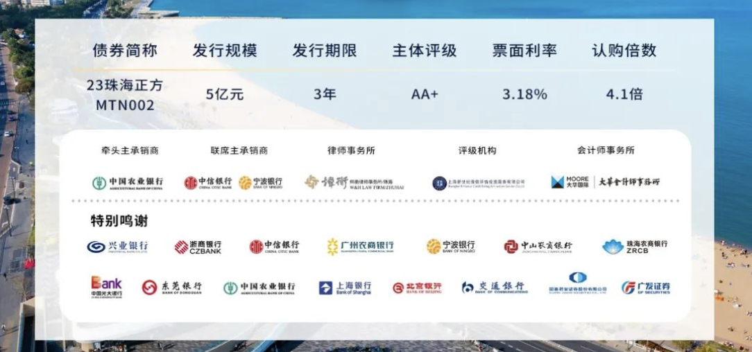 本次發(fā)行規(guī)模5億元,期限3年,票面利率3.18%。得益于正方集團(tuán)綜合實力的不斷提升以及市場信譽的逐步加強(qiáng),此次發(fā)行受到興業(yè)銀行、浙商銀行、中信銀行、寧波銀行、廣州農(nóng)商行、中山農(nóng)商行、珠海農(nóng)商行、東莞銀行及其他眾多投資機(jī)構(gòu)的大力支持,也體現(xiàn)了資本市場對珠海及香洲區(qū)經(jīng)濟(jì)穩(wěn)健發(fā)展的高度認(rèn)可和關(guān)注。