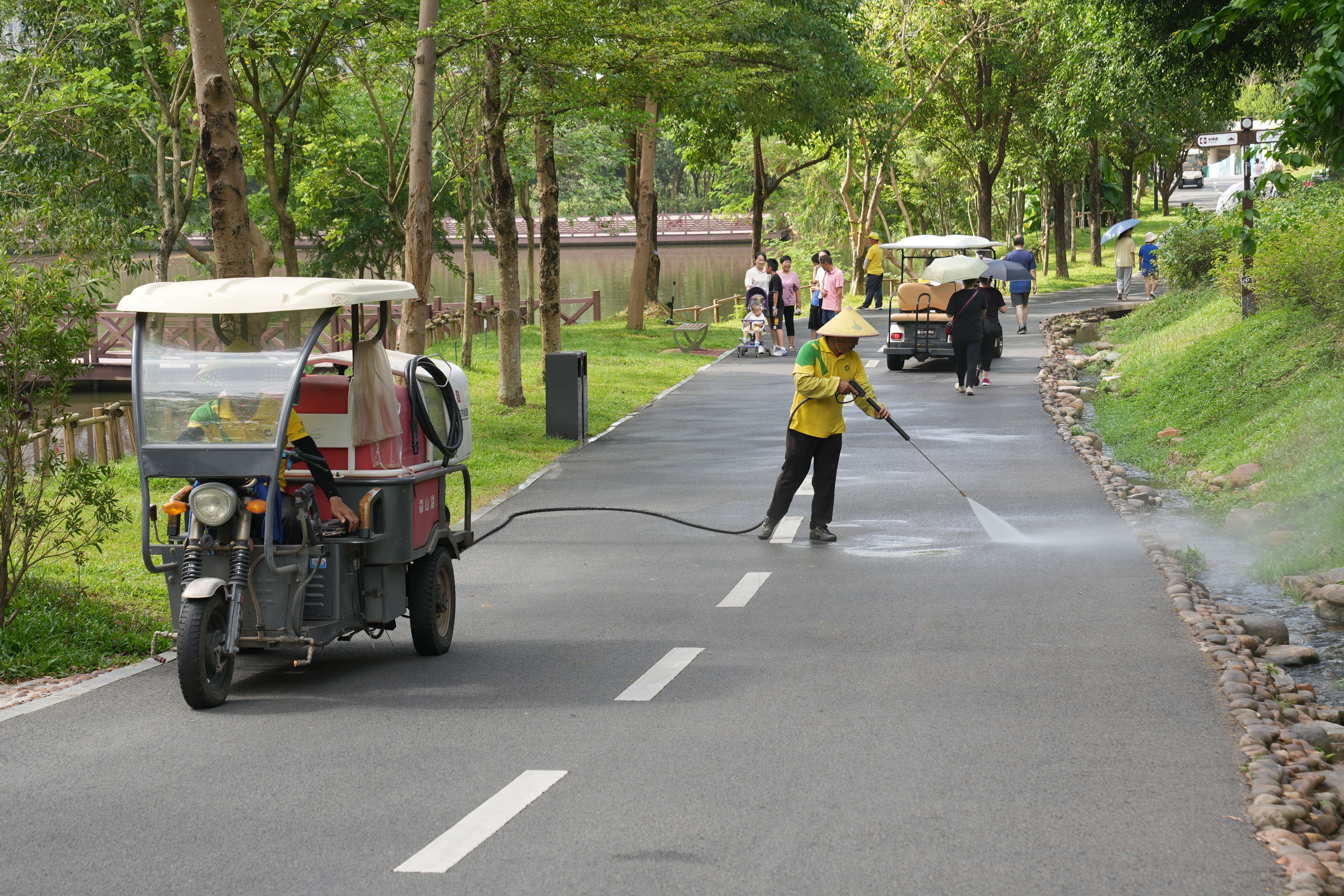 在情侶路、香山云道沿線及各大公園,正方集團(tuán)根據(jù)現(xiàn)場情況動態(tài)調(diào)派人員,開展秩序維護(hù)、交通疏導(dǎo)、安全巡查、停車場管理、共享單車擺放等工作;增設(shè)臨時垃圾桶,在日常清掃保潔的基礎(chǔ)上增加清掃、灑水作業(yè);在菱角咀慢行路段南端、東風(fēng)路口處設(shè)置電動車接駁點,為游客提供便捷的乘車服務(wù)。