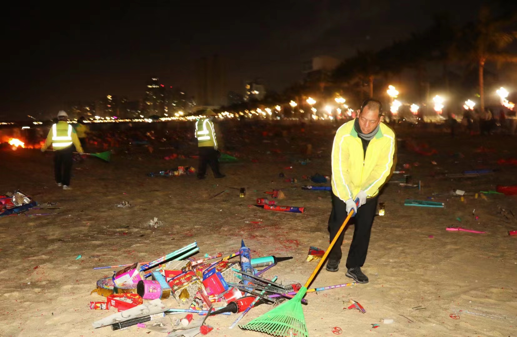 本次煙花燃放清理工作的難點(diǎn)區(qū)域是海天公園沙灘。大型煙花燃放后,大量的碎屑會(huì)隱藏在沙子里。為此,保潔清理隊(duì)伍分條塊對(duì)海灘進(jìn)行仔細(xì)梳理清潔,靠人力一點(diǎn)點(diǎn)撿拾,將沙子里混雜的煙花爆竹碎屑梳理出來(lái),然后用拖運(yùn)車轉(zhuǎn)運(yùn)至集中存放點(diǎn)。