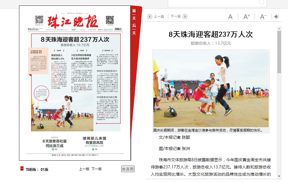 珠海市文體旅游局8日披露數(shù)據(jù)顯示,今年國(guó)慶黃金周全市共接待游客237.17萬(wàn)人次,旅游總收入13.7億元。接待人數(shù)和旅游總收入均實(shí)現(xiàn)同比增長(zhǎng)。大型文化旅游活動(dòng)的品牌效應(yīng)成為推動(dòng)增長(zhǎng)的重要引擎之一。