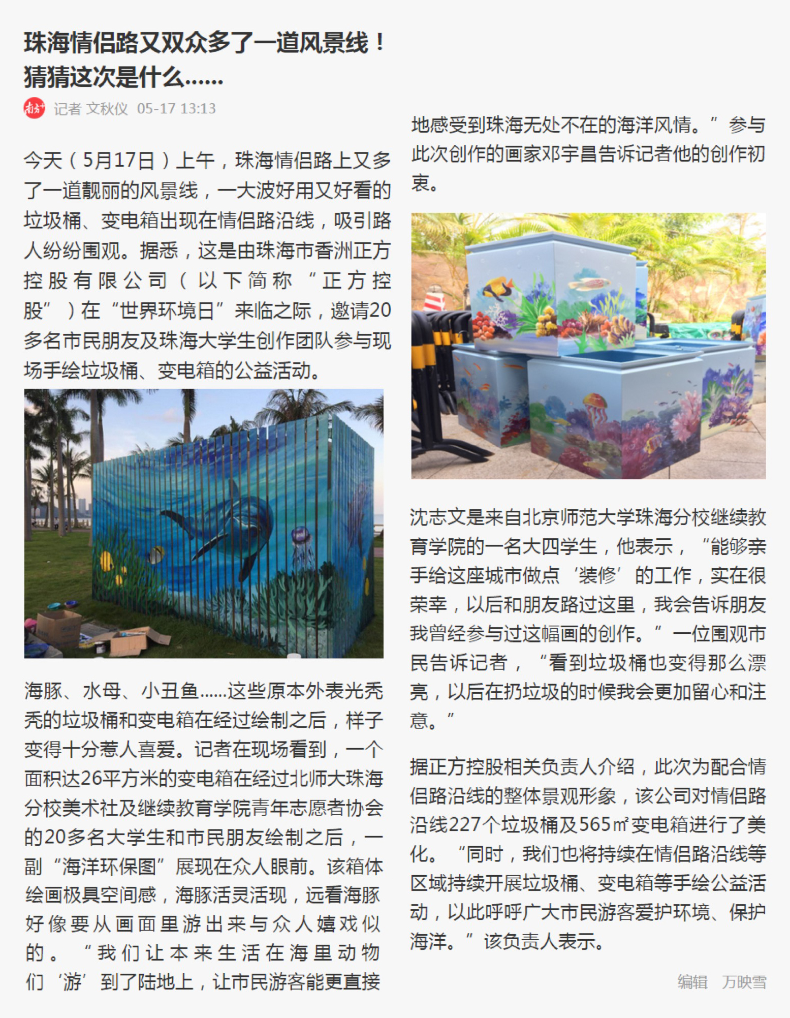 今天(5月17日)上午,珠海情侶路上又多了一道靚麗的風(fēng)景線,一大波好用又好看的垃圾桶、變電箱出現(xiàn)在情侶路沿線,吸引路人紛紛圍觀。據(jù)悉,這是由珠海市香洲正方控股有限公司(以下簡(jiǎn)稱“正方控股”)在“世界環(huán)境日”來(lái)臨之際,邀請(qǐng)20多名市民朋友及珠海大學(xué)生創(chuàng)作團(tuán)隊(duì)參與現(xiàn)場(chǎng)手繪垃圾桶、變電箱的公益活動(dòng)。
