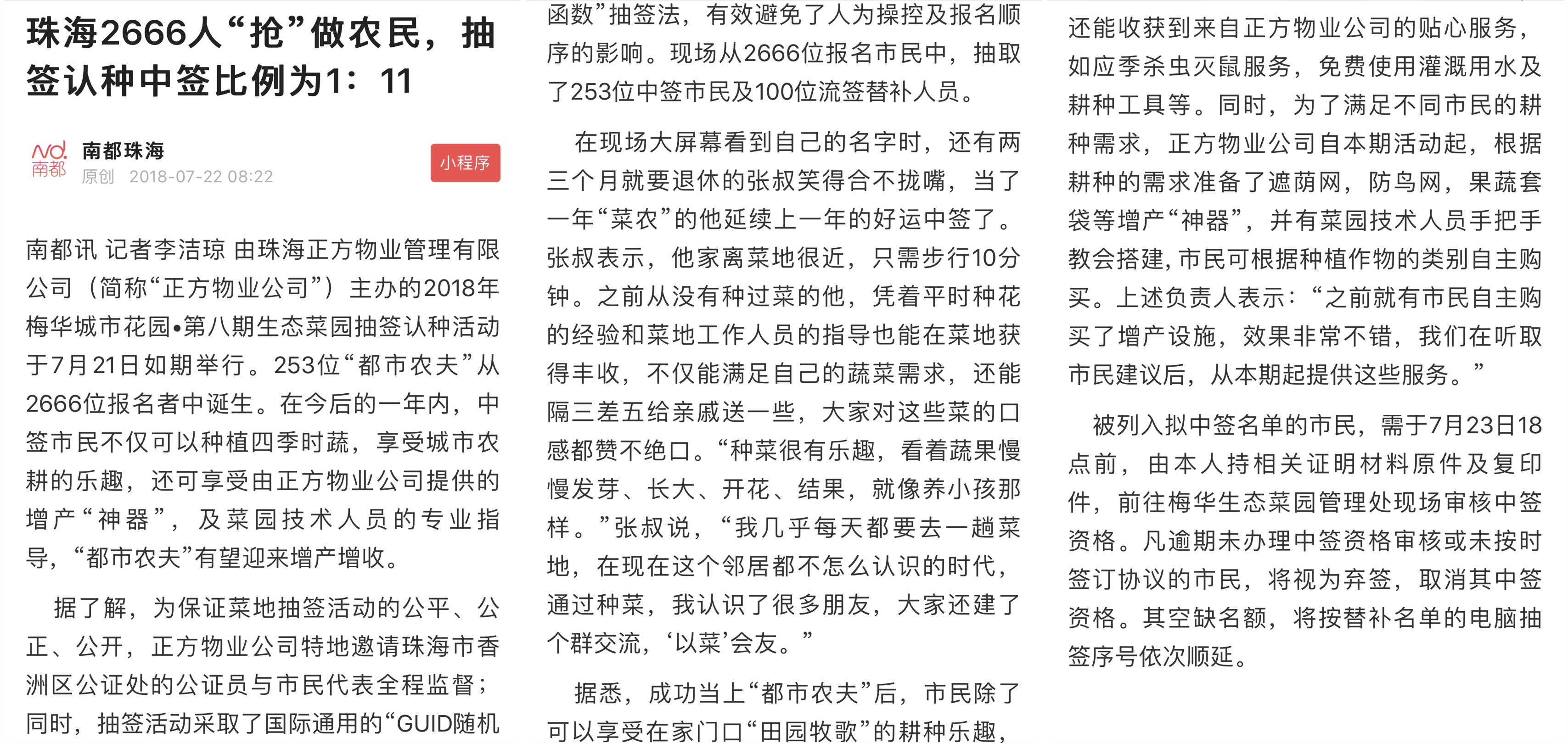 據(jù)了解,為保證菜地抽簽活動(dòng)的公平、公正、公開,正方物業(yè)公司特地邀請(qǐng)珠海市香洲區(qū)公證處的公證員與市民代表全程監(jiān)督;同時(shí),抽簽活動(dòng)采取了國(guó)際通用的“GUID隨機(jī)函數(shù)”抽簽法,有效避免了人為操控及報(bào)名順序的影響。現(xiàn)場(chǎng)從2666位報(bào)名市民中,抽取了253位中簽市民及100位流簽替補(bǔ)人員。