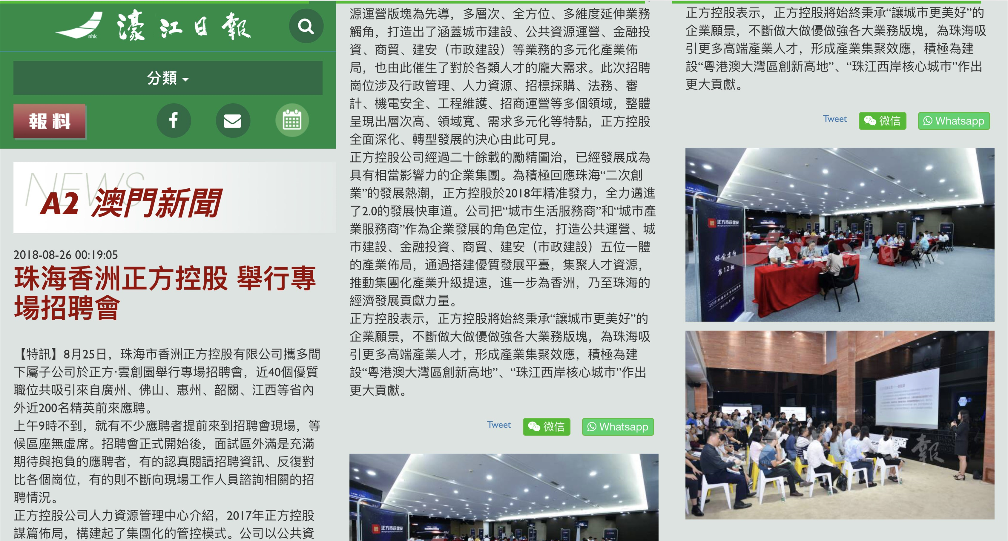 正方控股公司經過二十余載的勵精圖治,已經發(fā)展成為具有相當影響力的企業(yè)集團。為積極回應珠?!岸蝿?chuàng)業(yè)”的發(fā)展熱潮,正方控股于2018年精準發(fā)力,全力邁進了2.0的發(fā)展快車道。公司把“城市生活服務商”和“城市產業(yè)服務商”作為企業(yè)發(fā)展的角色定位,打造公共運營、城市建設、金融投資、商貿、建安(市政建設)五位一體的產業(yè)布局,通過搭建優(yōu)質發(fā)展平臺,集聚人才資源,推動集團化產業(yè)升級提速,進一步為香洲,乃至珠海的經濟發(fā)展貢獻力量。