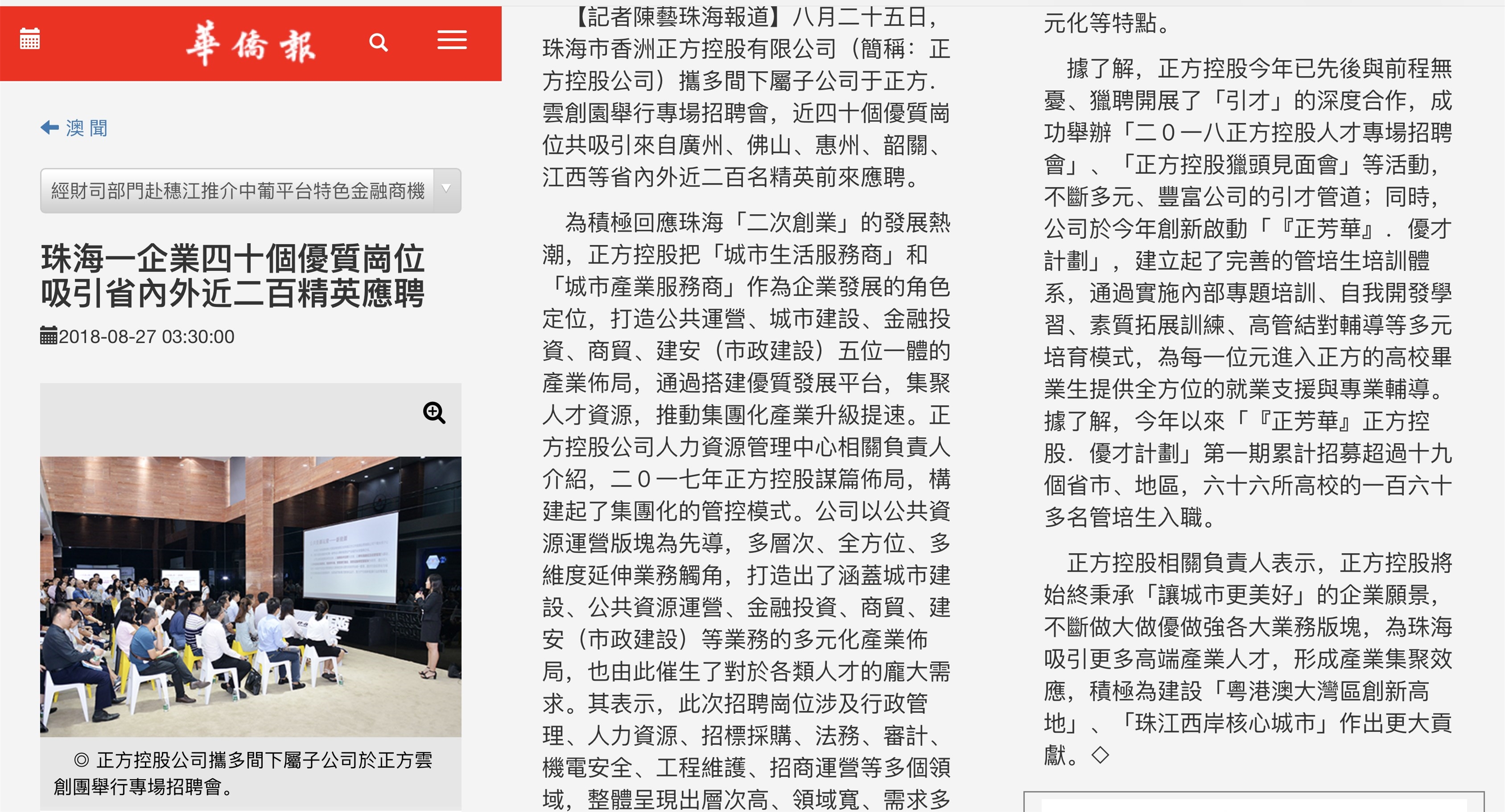 為積極回應(yīng)珠?!付蝿?chuàng)業(yè)」的發(fā)展熱潮,正方控股把「城市生活服務(wù)商」和「城市產(chǎn)業(yè)服務(wù)商」作為企業(yè)發(fā)展的角色定位,打造公共運(yùn)營(yíng)、城市建設(shè)、金融投資、商貿(mào)、建安(市政建設(shè))五位一體的產(chǎn)業(yè)布局,通過(guò)搭建優(yōu)質(zhì)發(fā)展平臺(tái),集聚人才資源,推動(dòng)集團(tuán)化產(chǎn)業(yè)升級(jí)提速。正方控股公司人力資源管理中心相關(guān)負(fù)責(zé)人介紹,二0一七年正方控股謀篇布局,構(gòu)建起了集團(tuán)化的管控模式。公司以公共資源運(yùn)營(yíng)版塊為先導(dǎo),多層次、全方位、多維度延伸業(yè)務(wù)觸角,打造出了涵蓋城市建設(shè)、公共資源運(yùn)營(yíng)、金融投資、商貿(mào)、建安(市政建設(shè))等業(yè)務(wù)的多元化產(chǎn)業(yè)布局,也由此催生了對(duì)于各類人才的龐大需求。其表示,此次招聘崗位涉及行政管理、人力資源、招標(biāo)采購(gòu)、法務(wù)、審計(jì)、機(jī)電安全、工程維護(hù)、招商運(yùn)營(yíng)等多個(gè)領(lǐng)域,整體呈現(xiàn)出層次高、領(lǐng)域?qū)?、需求多元化等特點(diǎn)。