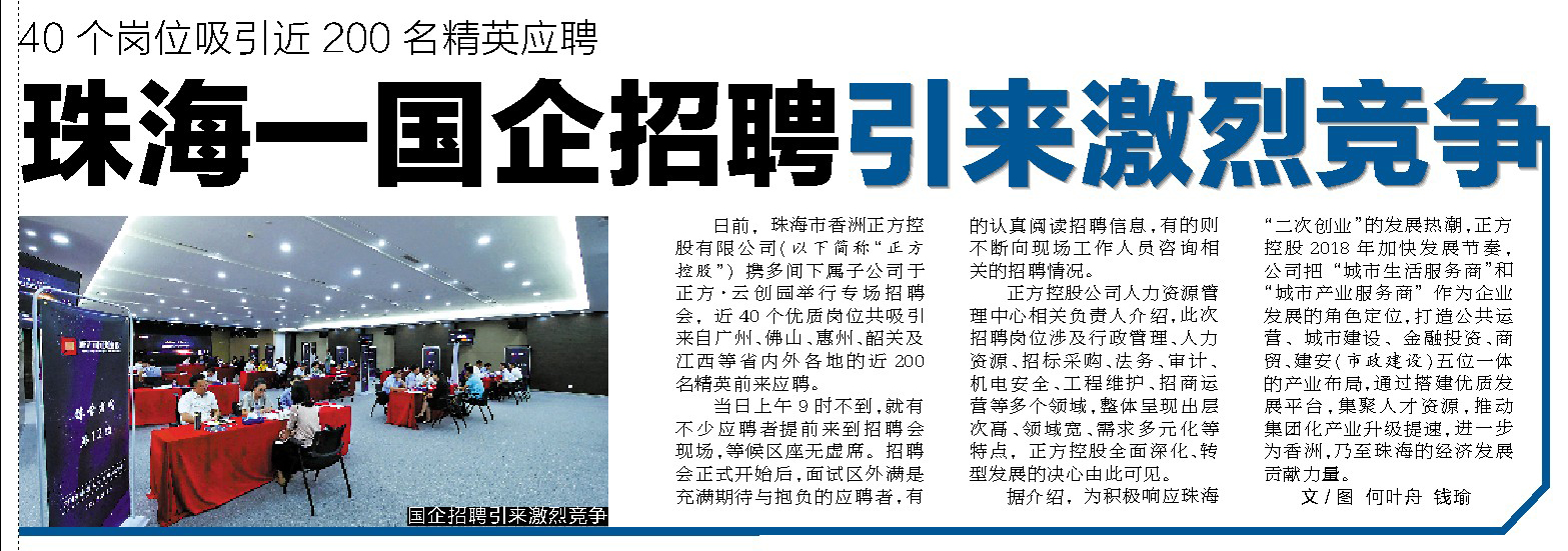 日前,珠海市香洲正方控股有限公司(以下簡(jiǎn)稱“正方控股”)攜多間下屬子公司于正方·云創(chuàng)園舉行專場(chǎng)招聘會(huì),近40個(gè)優(yōu)質(zhì)崗位共吸引來(lái)自廣州、佛山、惠州、韶關(guān)及江西等省內(nèi)外各地的近200名精英前來(lái)應(yīng)聘。