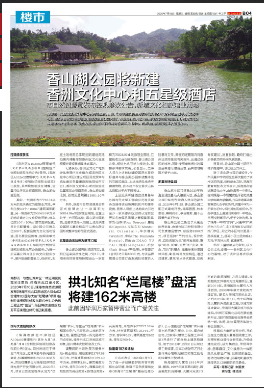 其中,一處面積為77718.81平方米的地塊確定為旅館業(yè)用地,停車位按0.3個(gè)/100m2建筑面積配置。另一塊面積為25004.51平方米的地塊確定為文化設(shè)施用地,停車位按1.0個(gè)/100m2建筑面積配置,并補(bǔ)充配置香山湖公園公共停車位360個(gè),配套設(shè)施為文化活動(dòng)設(shè)施、圖書(shū)展覽設(shè)施等。按照該單元(香洲區(qū)A102e02管理單元(文化中心及酒店項(xiàng)目))早前的控制性詳細(xì)規(guī)劃修改批前公告顯示,為進(jìn)一步完善公園片區(qū)公共文化服務(wù)水平,提升旅游配套能力,經(jīng)研究,擬在土地利用總體規(guī)劃的建設(shè)用地范圍內(nèi)調(diào)整增加香洲區(qū)文化設(shè)施規(guī)模并建設(shè)高端園林式酒店。