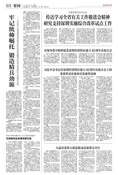 10月14日上午,深圳經(jīng)濟(jì)特區(qū)建立40周年慶祝大會(huì)隆重舉行。習(xí)近平總書記在慶祝大會(huì)上的重要講話鼓舞人心、催人奮進(jìn),在我市廣大干部群眾中引發(fā)強(qiáng)烈反響。大家紛紛表示,將以習(xí)近平總書記的重要講話為遵循,繼續(xù)弘揚(yáng)敢闖敢試、敢為人先、埋頭苦干的特區(qū)精神,堅(jiān)定不移貫徹落實(shí)黨中央決策部署,永葆“闖”的精神、“創(chuàng)”的勁頭、“干”的作風(fēng),為珠海“二次創(chuàng)業(yè)”加快發(fā)展作出新的更大貢獻(xiàn)。