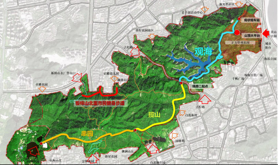 板樟山山地步道沿板樟山南面山腰而建,全線長8553米。根據(jù)不同風景特色分為串園、攬山、觀海三個主題段,自西向東串聯(lián)起圓明新園、澳門回歸公園、白蓮洞公園、吉大水庫、景山公園,直至城市陽臺,打造通山、達海、串園的無障礙特色山地步道。