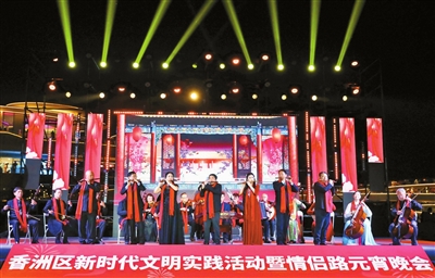 本報(bào)訊 記者康振華報(bào)道:火樹銀花元宵夜,彩燈萬(wàn)盞熠霞流。2月5日晚,正方城市陽(yáng)臺(tái)輕歌曼舞、琴聲悠揚(yáng),“正元宵·方春意”2023年香洲區(qū)“相約情侶路·音樂進(jìn)萬(wàn)家”元宵晚會(huì)暨“音樂進(jìn)萬(wàn)家·共奏文明曲”新時(shí)代文明實(shí)踐活動(dòng)在此精彩上演,為觀眾獻(xiàn)上了一場(chǎng)喜慶祥和、熱鬧歡樂的視聽盛宴,吸引了大量市民游客駐足觀看,共享精神文化大餐。