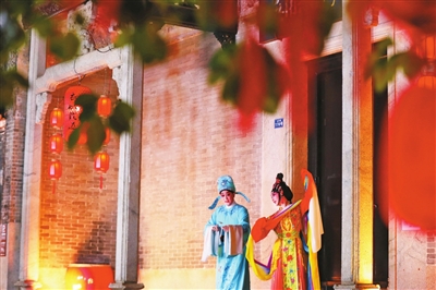 山房路上的無用手工紡織傳習(xí)館前,婉轉(zhuǎn)粵韻在百年祠堂間飄揚(yáng),中國戲劇梅花獎(jiǎng)得主瓊霞和來自香港的粵劇藝術(shù)家黃偉坤帶來了《紫釵記之燈街拾翠》,古建筑與傳統(tǒng)曲藝交相輝映,古典美與建筑美相互映照,讓觀眾身臨其境感受珠海歷史人文底蘊(yùn)及傳統(tǒng)文化魅力。