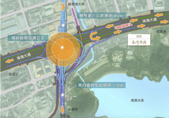 此外,“橫琴第三公路通道”還計劃在珠海大道南屏水庫段建設一個新的十字互通立交,從橫琴向北經黑白面將軍山隧道穿山直通南灣,大大縮短了橫琴至南灣的距離,使南灣真正成為東西向和南北向大動脈的交匯之地。一上立交,就能快速直通珠海東西南北各核心組團,并快速連接市外高快速路網。
