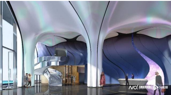 △大堂及大堂吧以海邊“天幕”為靈感,讓極具活力的海邊“天幕”融合海岸線的張力,營造出極具生命力的舒適樂享空間。全海景的酒店建筑呈現(xiàn)出流暢自由的弧形結(jié)構(gòu),運(yùn)用金屬、玻璃等不同材質(zhì)構(gòu)建出了極具未來感的風(fēng)格立面,與相鄰的海洋館遙相呼應(yīng)。